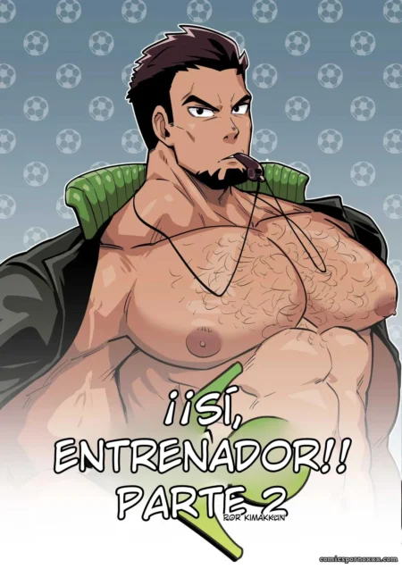 Un musculoso hombre sentado en una silla verde habla con emoción mientras un pez gordo se mueve entre sus piernas. El texto en la imagen es "¡¡Sí, Entrenador!!" y "¡¡Sí, Entrenador!!". El ambiente es un juego de fútbol con balones blancos en el fondo. El personaje habla con entusiasmo, el pez gordo se mueve con energía y el entrenador responde con emoción.